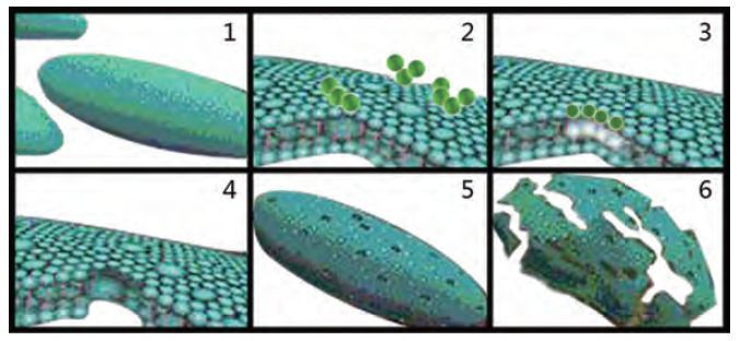 臭氧消毒是通過臭氧的強氧化作用破壞微生物細胞壁表面成分來滅活微生物,臭氧分子有很強的滲透細胞膜的能力,它會氧化微生物所有必需成分(酶,蛋白質,DNA,RNA)。在這個過程中,當細胞膜損壞時,細胞會分解,這被稱為裂解。臭氧裂解細菌具體步驟如圖1,其中:1)模擬細菌細胞;2)細菌細胞壁上的臭氧分子的特寫;3)臭氧滲透細胞壁并導致細胞壁被腐蝕;4)臭氧對細胞壁的影響的特寫;5)細菌細胞在與許多臭氧分子接觸后;6)細胞破壞(裂解)。臭氧還能與水分子反應分解形成具有極強氧化性的羥基(OH-),它也有與水溶液中其他雜質發生作用的氧化能力[1]。YVp臭氧發生器_臭氧消毒機_臭氧水機_制氧機_廣州佳環電器【官網】
